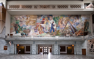 Lábunk legyökerezett és le kellett ülnünk percekig csak az innen elénk táruló fjordot nézni. Ahogyan a víz betolakszik a városba, s a város befogadja, sőt önmaga részévé teszi, az csak itt Norvégiában volt számomra érezhető, s ez csak az első ilyen látvány volt. Itt már sok hajó és sok (a „sok” fogalma itt relatív) ember közlekedett. A hajó, mint fő közlekedési eszköz vezetése és parkolása teljesen természetes, talán természetesebb, mint az autók, de hogyan is lenne ez a vikingek leszármazottainál másképpen. Az erődből jól látható volt a Városháza, amelynek tornyai őrzik a kikötőt. Lesétáltunk és megnéztük a vörös kőből emelt jelképet. A belső terek freskói az 50-es évek szovjet monumentális festményeit idézték számomra. Jelenetek a mindennapi életből, a mitológiából, a történelemből. S mindez hatalmas felületeken, csöppet sem szemérmes módon.