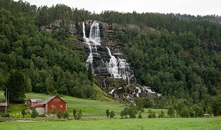 Sziklák és kövek, a természet változásának emlékei és az ember által itt hagyott emlékek. Ugyanis innen nem elvisz a turista, hanem itt épít, méghozzá a hóolvadáskor lesodort kövekből oszlopokat, amelyek álldogáló emberekként vigyázzák a természet eme csodáját. Nem hagyhattuk ki, hogy a leereszkedés során megálljunk egy útszéli padnál, s előkapjuk a piknik kosarat, amelyben keveredtek a magyar és a norvég finomságok. A Sogne-fjord mellett autóztunk el, s jócskán estefele volt már, amikor Bergen közelébe, Voss nevű településhez értünk. Itt is meg kellett állnunk, mert olyan vízesés látványa tárult elénk, amely mellett nemhogy elmenni nem lehetett, de azóta is meg kell néznünk időnként a fotót,