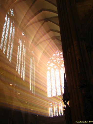 Abban a pillanatban, amikor beértünk, már robbant is a közelben egy bomba, amely megvilágította a hatalmas, színes üvegablakokat.